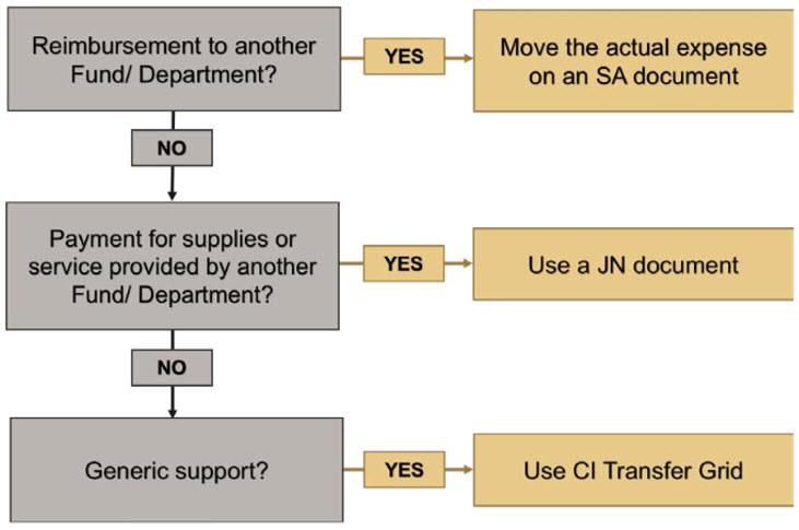 Step 3: If neither of the above scenarios fit, you may need to process a transfer document. In order to mitigate the negative impact transfers have on University Financial Statements, transfers need to be closely scrutinized. Review the Guidelines shown below in this document for full review questions. However, if the money is being used to provide generic support with no specific guidelines on how it is to be spent, then process a JV with a SA document and use the new CI Transfer Grid (See Appendix B) for appropriate CI’s.
