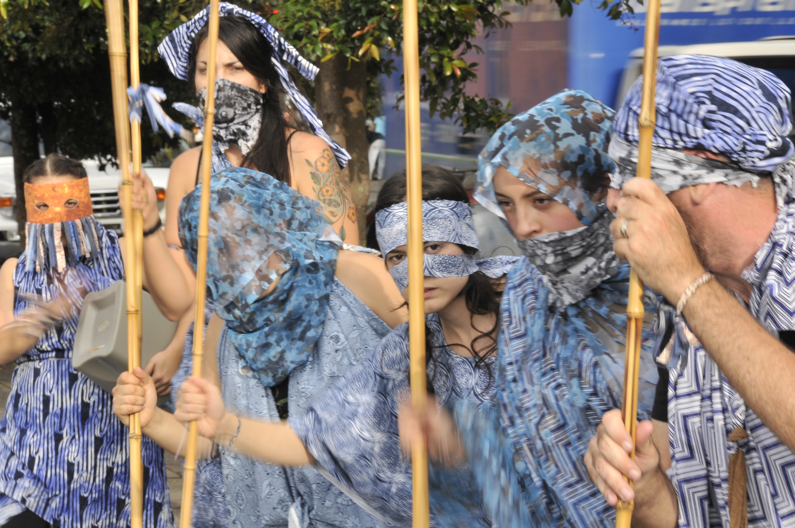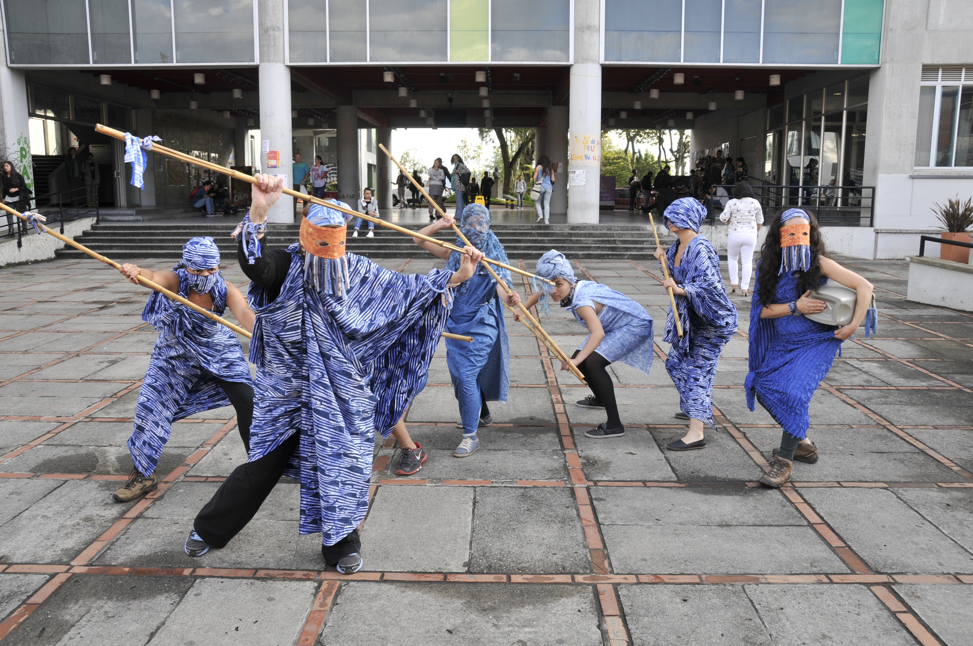 For this iteration of the project, Purdue faculty trained student performers from Manizales and Bogota in a simplified version of the choreography developed for the original project. Performers created their own costumes using a defined aesthetic and materials provided by the Purdue artists. Three separate tribes were created, each led by a member of the Purdue team. The tribes then left campus and moved through the city of Manizales, interacting with the urban environment. The tribes encountered curious pedestrians, rush-hour traffic, angry canines, street vendors, and intrigued and bemused bystanders. The experience was exhilarating, challenging, and ultimately very rewarding for everyone involved. The Purdue professors, whose command of the Spanish language is tourist-level at best, remarked on what they suspected to be true – that despite language barriers, the arts transcend language and cultural limitations. Colombian students and American faculty were able to communicate and more importantly connect – though the assistance of a student translator didn’t hurt!