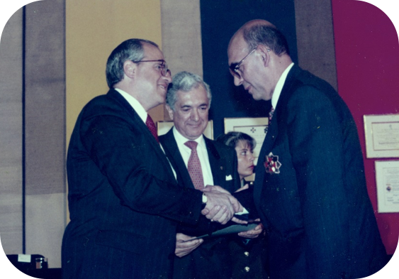Manuel García López receiving the "Julio Garavito Armero Order of Merit" in the category of Great Official - the maximum distinction the Colombian Government affords to praise the trajectory and professional merits of those engineers who have rendered important services to the nation. From left to right Dr. Ernesto Samper Pizano, President of the Republic of Colombia, Dr. Enrique Ramírez Romero, President of the Colombian Society of Engineers (also a Purdue Graduate) and Prof. Manuel García López. Bogotá, May 1997.
