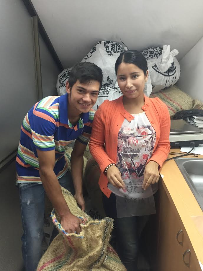 Claudio Bedoya and Paola Andrea Tabares, undergraduate students at Universidad de Caldas, collect coffee samples from traditional bags. Purdue PICS bags can be seen in the back.