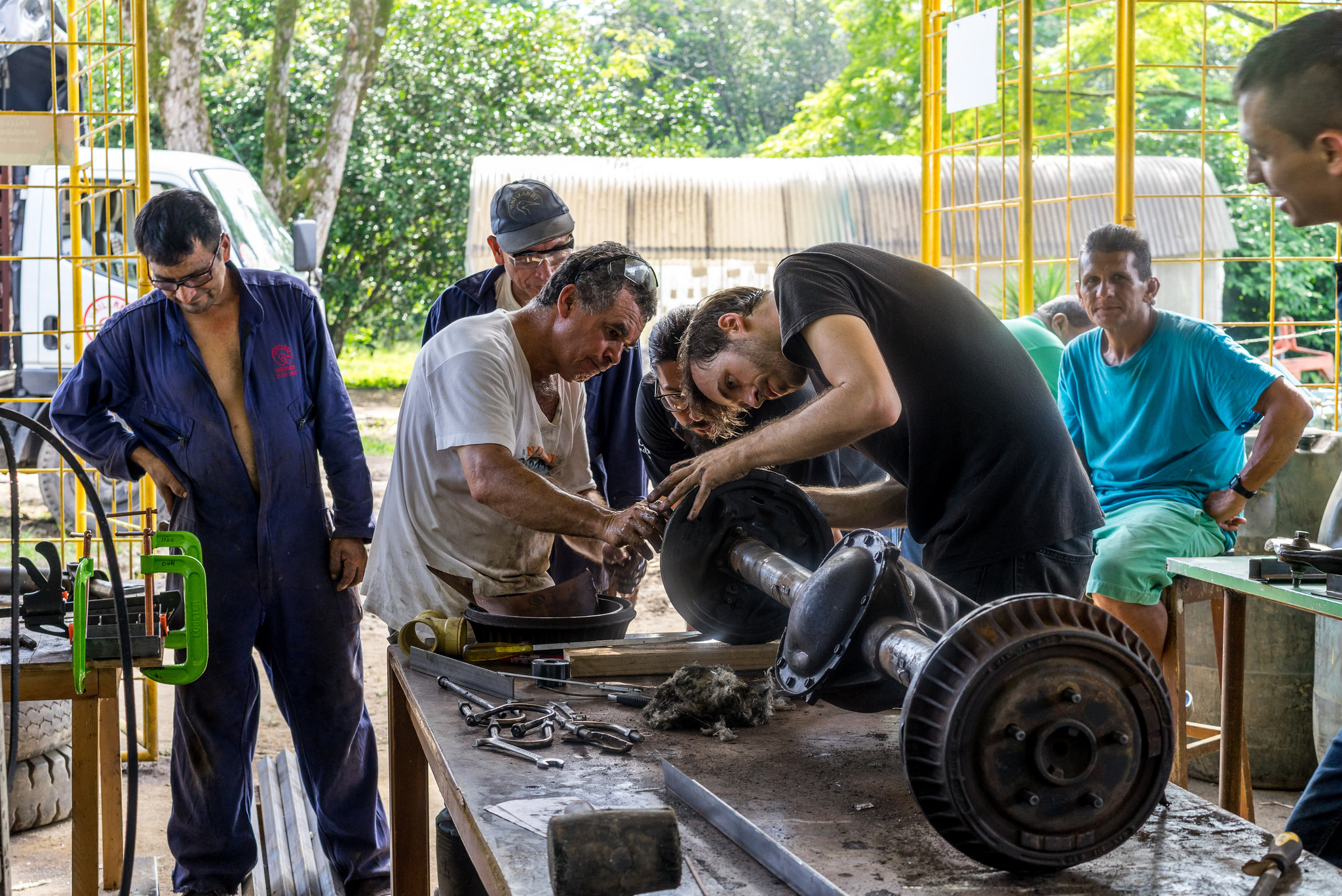 It's designed in modularity. In Colombia we used an old Ford axle; in other countries we use Toyota or Nissan axles, whatever vehicle parts are commonly available in that country.