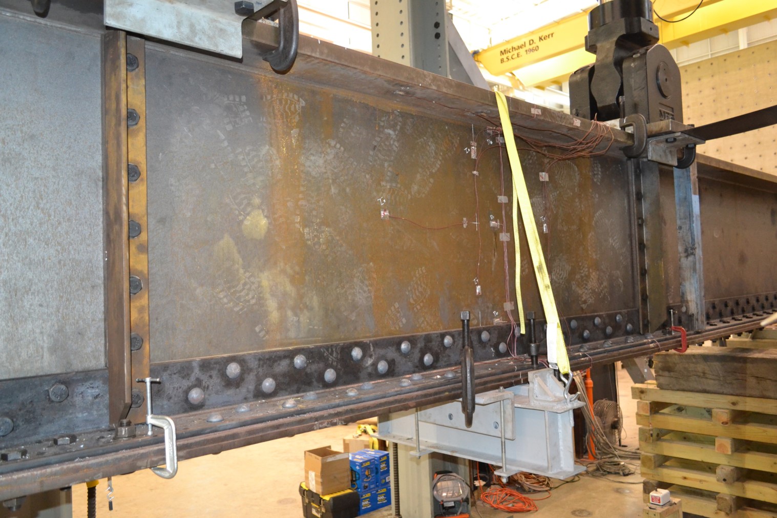 This girder was used in the experiential after-fracture fatigue and strength testing of built-up plate girders as part of pooled fund project TPF-5(253). It is an excellent example of built-up member construction where high-strength bolts are used.