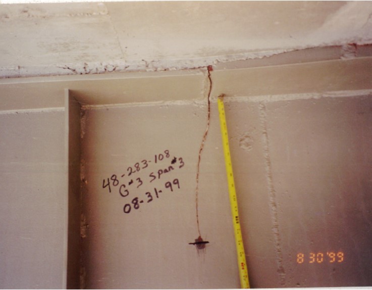 The girder is a 5’-2” welded plate girder. There were four girder lines and span which the fracture occurred was 120 ft. However, the overall length of the continuous girders was 432 ft. The fracture appeared to have initiated at a top flange welded splice where the flange section changed in both width and thickness. The detail used to make this transition was in incredibly poor detail where a beveled and tapering (in width) plate was but welded in (see photos). The fracture was found during our normal inspection on cycle. There was no distress observed in the remaining girders of this four-girder cross section. The girder was repaired with a bolted splice and carried traffic for years following the discovery of the fracture. The bridge has since been replaced.