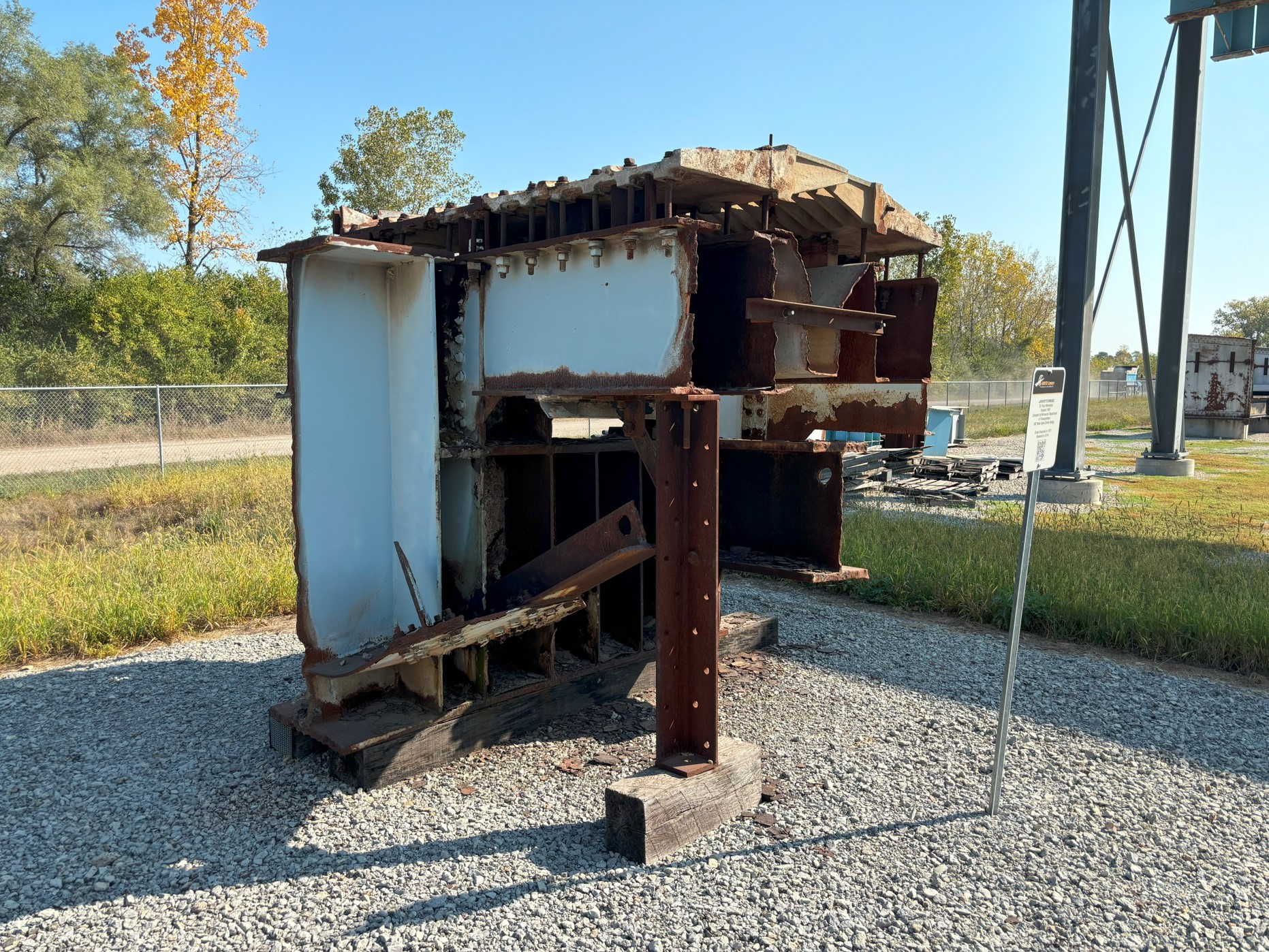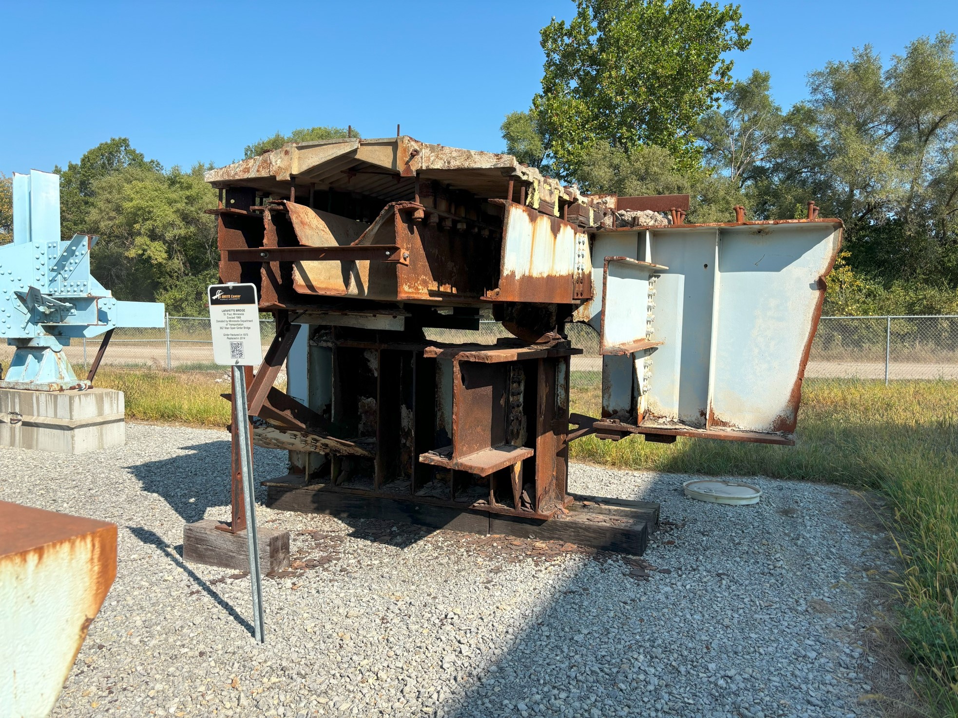 In 1975, the east girder on the southbound bridge fractured. This caused a 7-inch dip in the roadway. The fractured girder was jacked back into place and bolted together with splice plates. The cause of the fracture was a fatigue crack that started in a weld between a lateral gusset plate and a vertical web stiffener.  It is an excellent specimen illustrating the repairability of steel girders.  Other components donated include a “ship-lap” finger/tooth dam expansion joint that has significant corrosion.