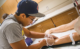 High school student Leroy Medrano works with a medical simulation mannequin or “sim man” during an activity at the Clinical Applications for Medical Professionals camp.
