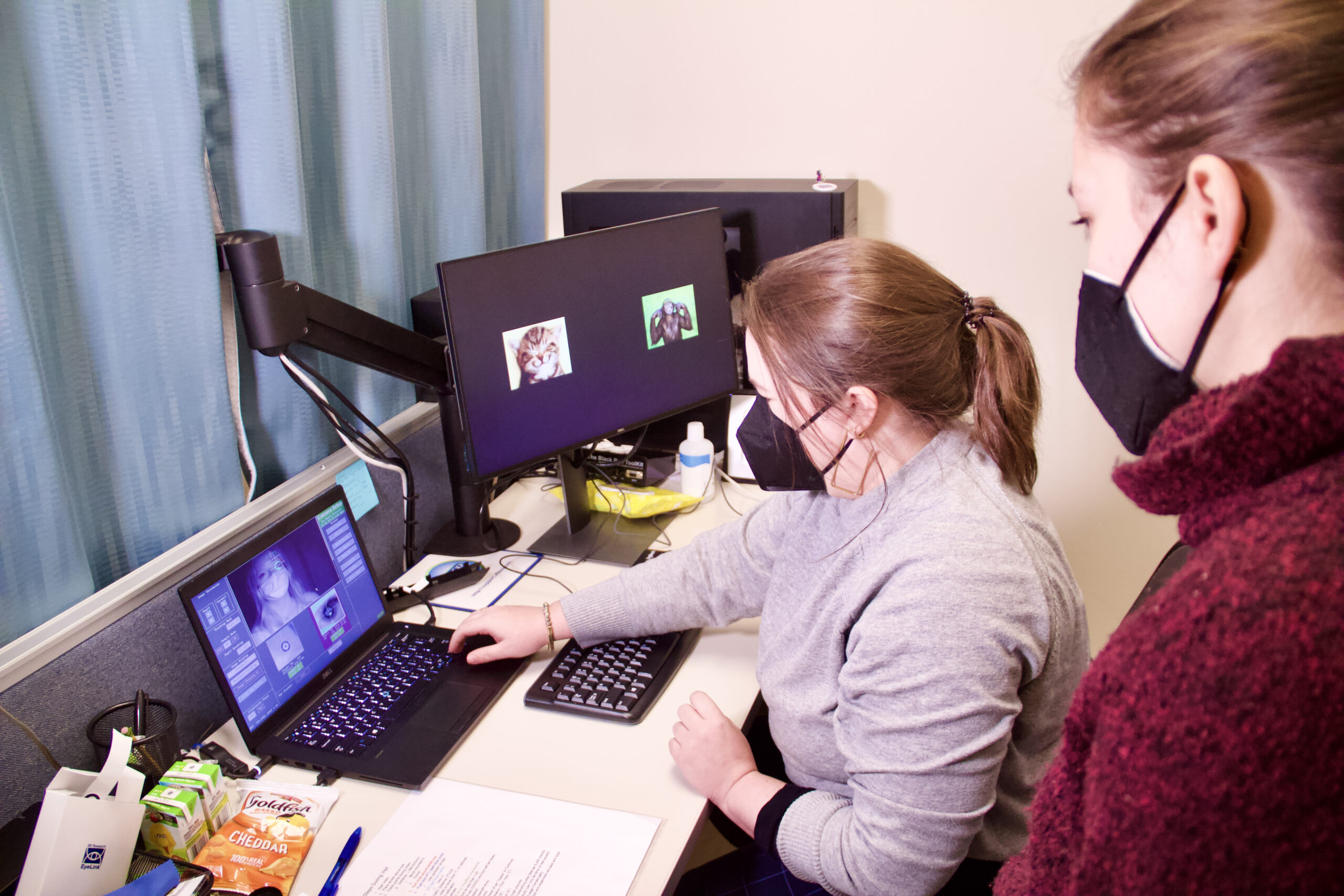 Behind a curtain, student LLAMA Lab researchers collect data while the young participant looks at images or videos on a monitor. The researchers record where the child looks at a screen, how long it takes for them to look at a correct object and how long they look.