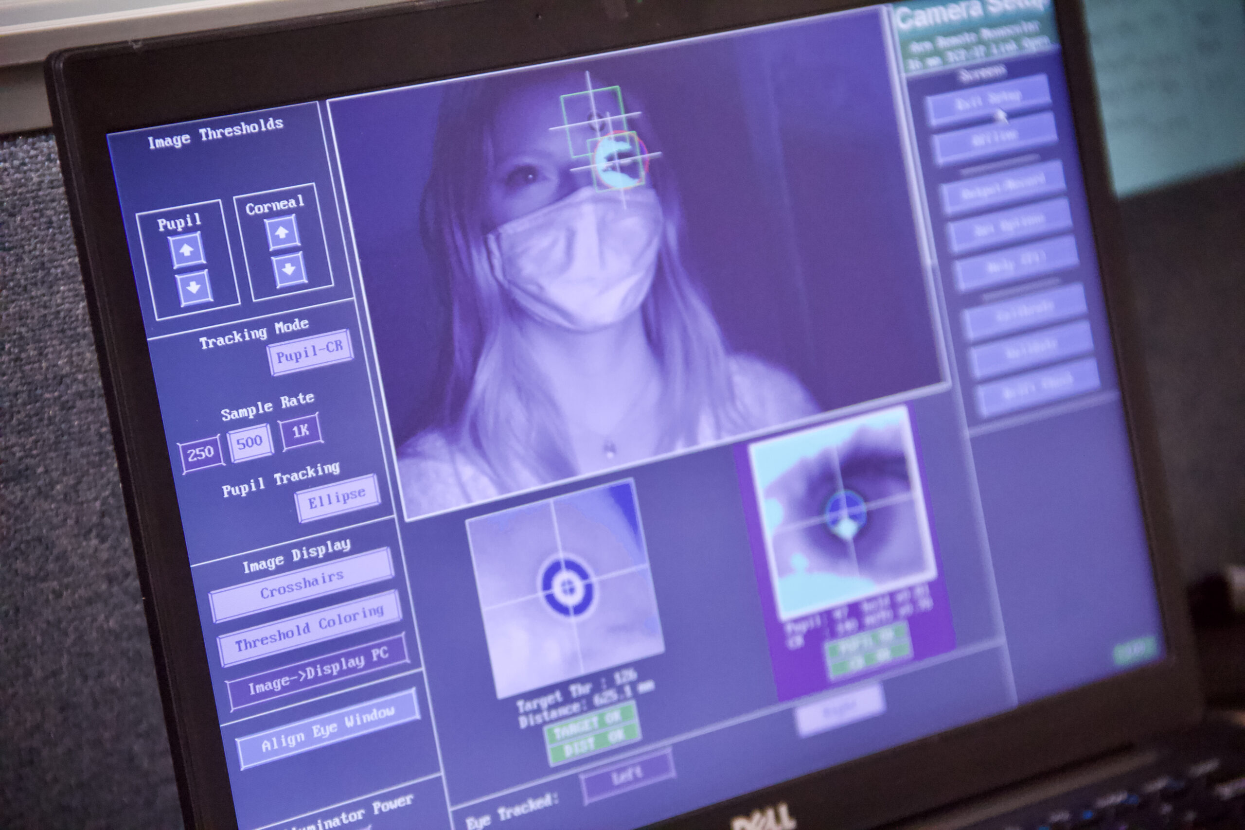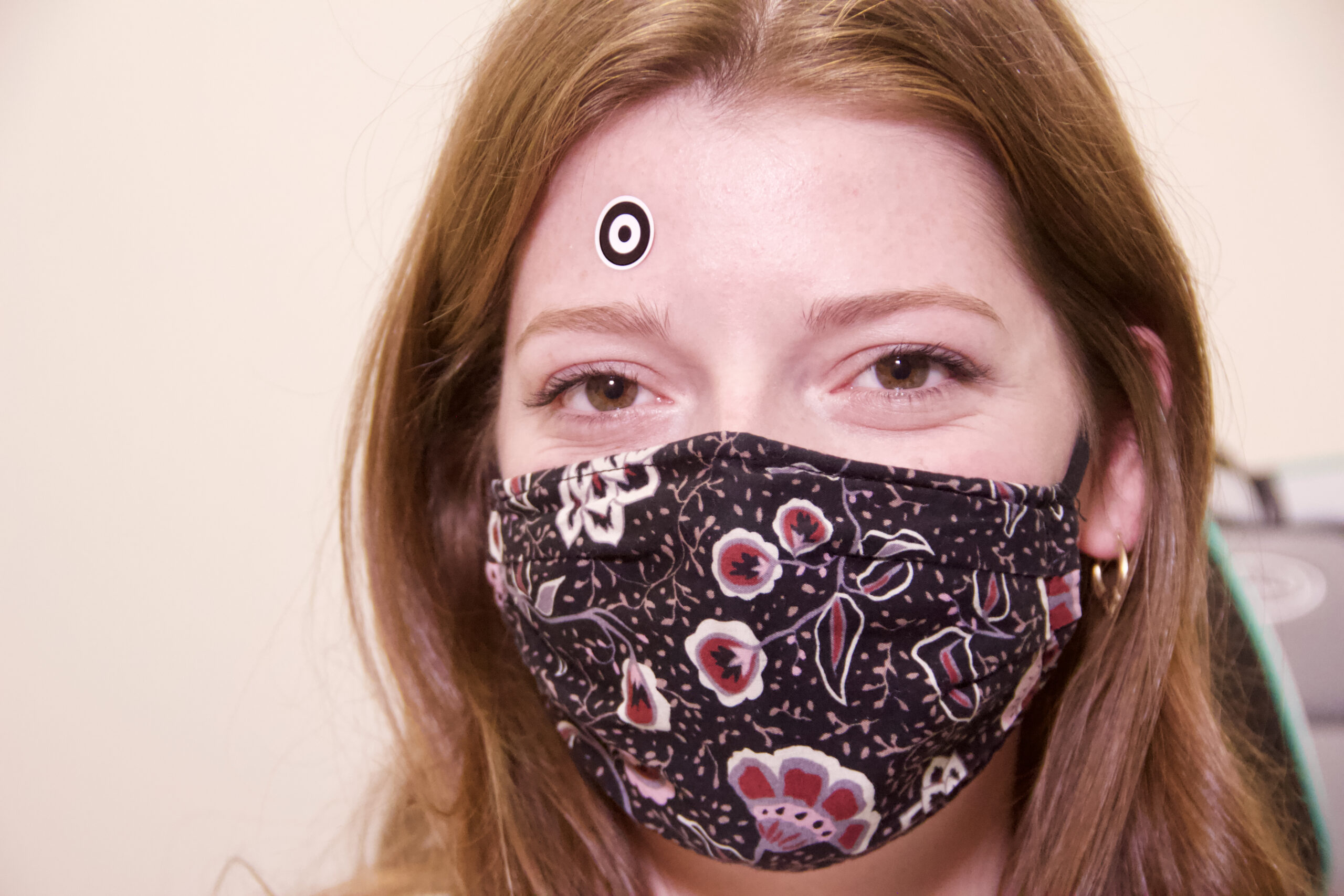 Data is often collected through eye-tracking technology. The young participants wear a tracking sticker above their right eye. A specialized infrared camera focuses on the sticker like a mini bullseye.