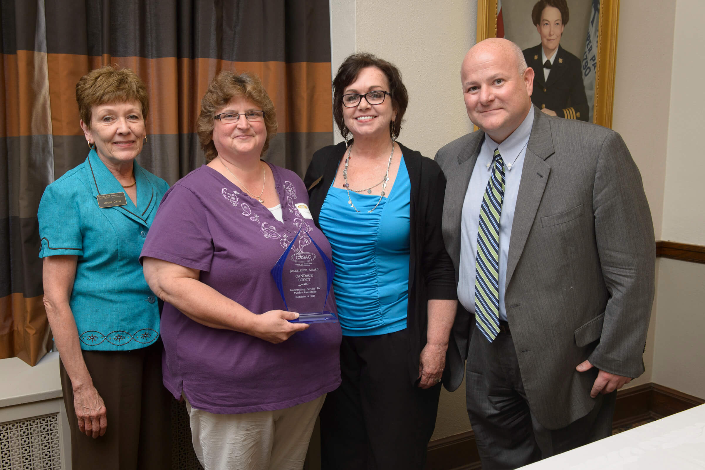 (From left) JoAnne Carow, assistant to the dean of Libraries; Candace Scott, 2015 CSSAC Excellence Award winner; Mitzi Barnett, outgoing CSSAC chair; and Trent Klingerman, vice president for human resources(Purdue University photo/John Underwood) |