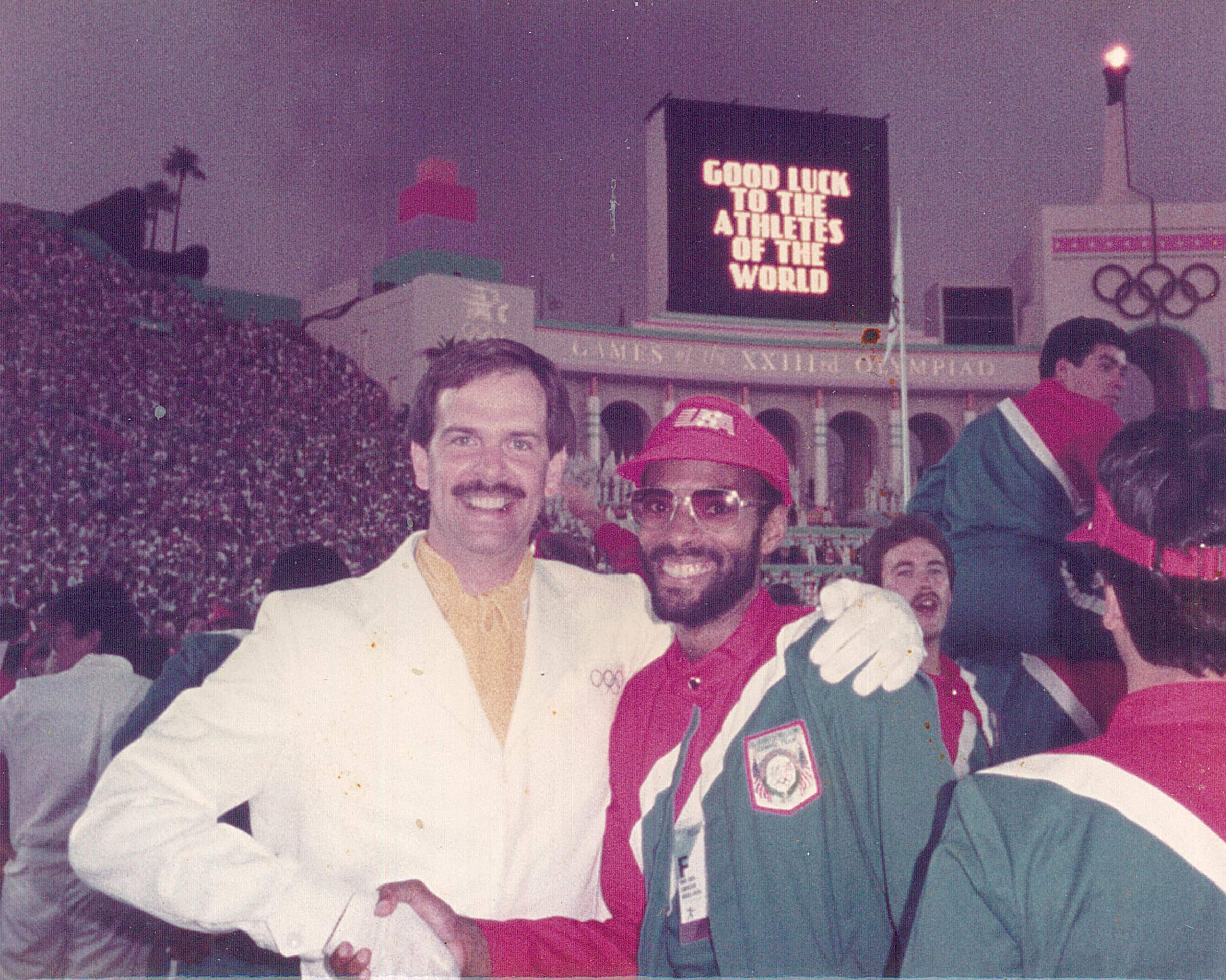 Mark Smith, dean of Purdue's Graduate School, shakes hands with swimmer John Naber at the opening ceremonies for the 1984 Summer Olympic Games in Los Angeles. Naber won five Olympic medals, including four gold, in swimming. Smith competed on the U.S. men’s fencing team at Los Angeles. (Photo provided by Mark Smith)