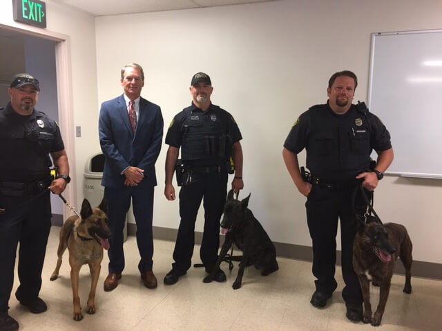 From left, K-9 officers Kevin Balzer and Senna, Albert Demello and Mocca, and Gabe Argerbright and Macho, were recognized along with Tippecanoe County Prosecutor Pat Harrington (second from left) during the ceremony. (Purdue University photo)