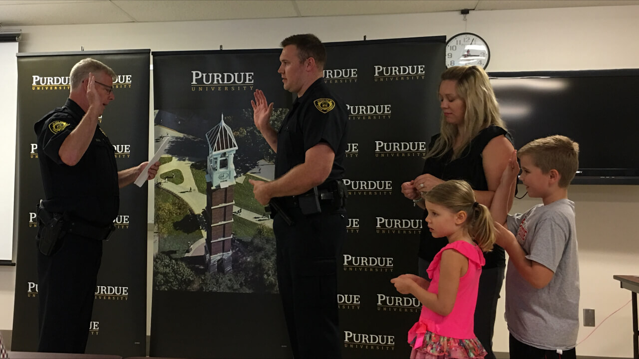 Allen B. Myles, flanked by his family, is sworn in as a Purdue police lieutenant by chief John Cox during a ceremony Monday. (Purdue University photo)