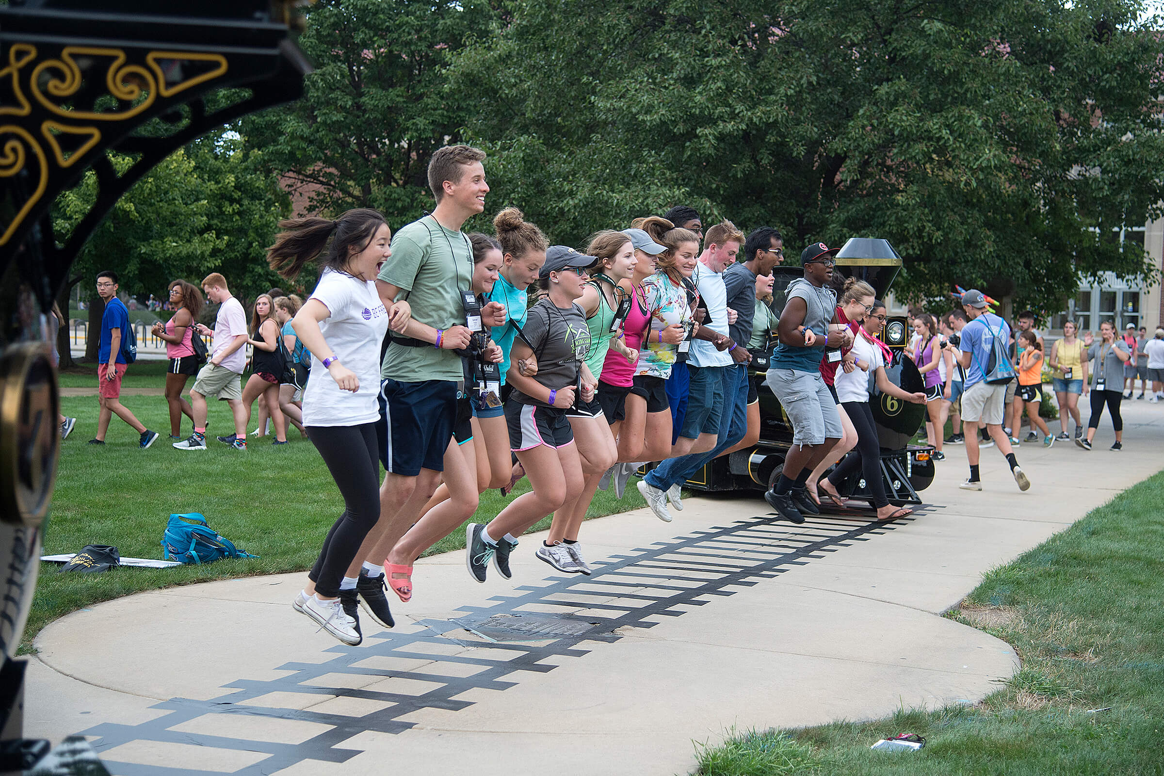 Incoming students participate in the traditional "Crossing the Tracks" event on Memorial Mall during Boiler Gold Rush. Purdue University set another record for total enrollment this fall. The university also reported that academic preparedness and graduation rates increased. (Purdue University/Mark Simons)