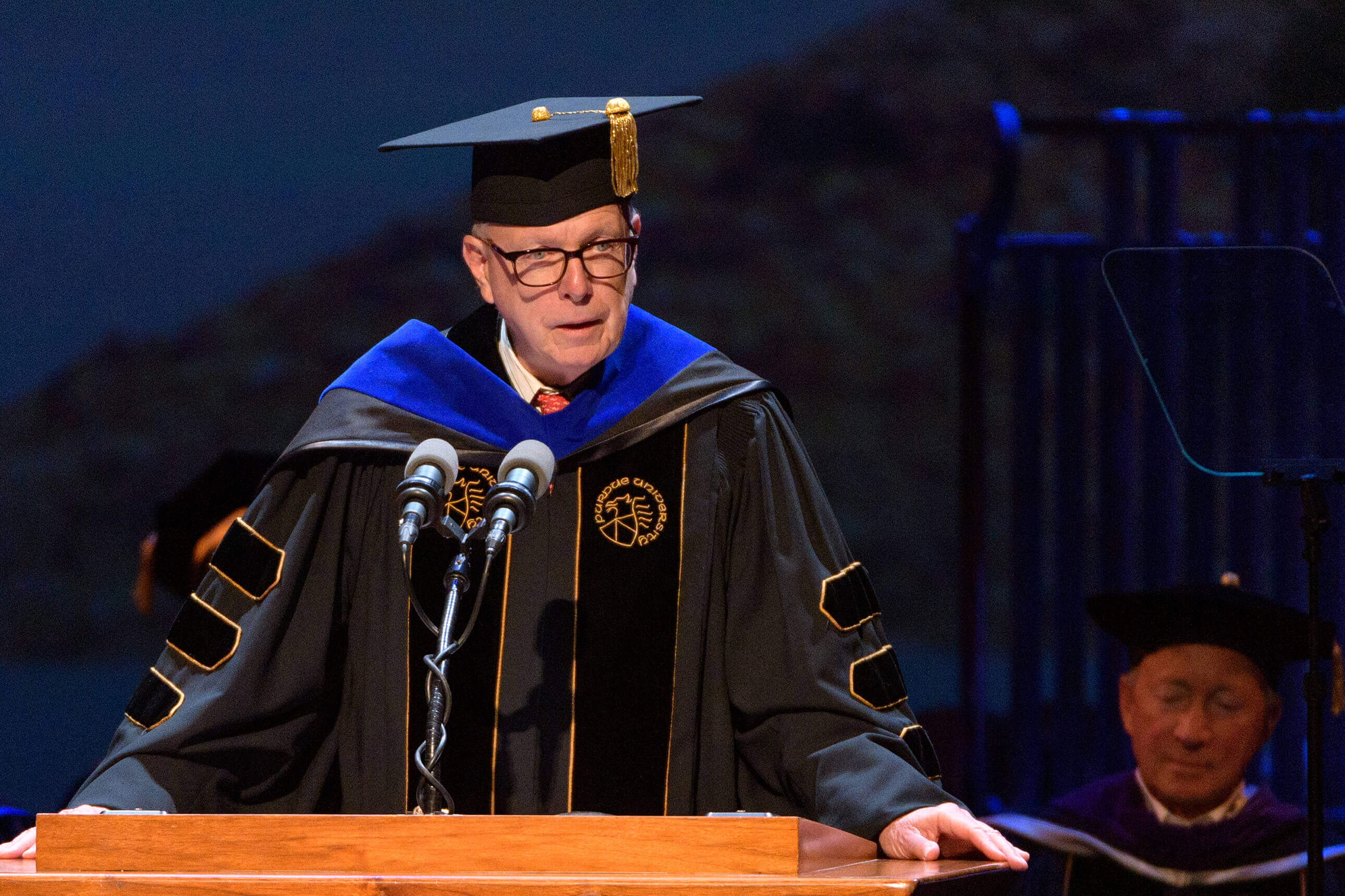 Purdue alumnus James Thomson, president emeritus of the RAND Corp., a nonprofit, nonpartisan institution that helps improve policy and decisions through research and analysis, provided the keynote address during Purdue University’s August 2019 commencement ceremony.