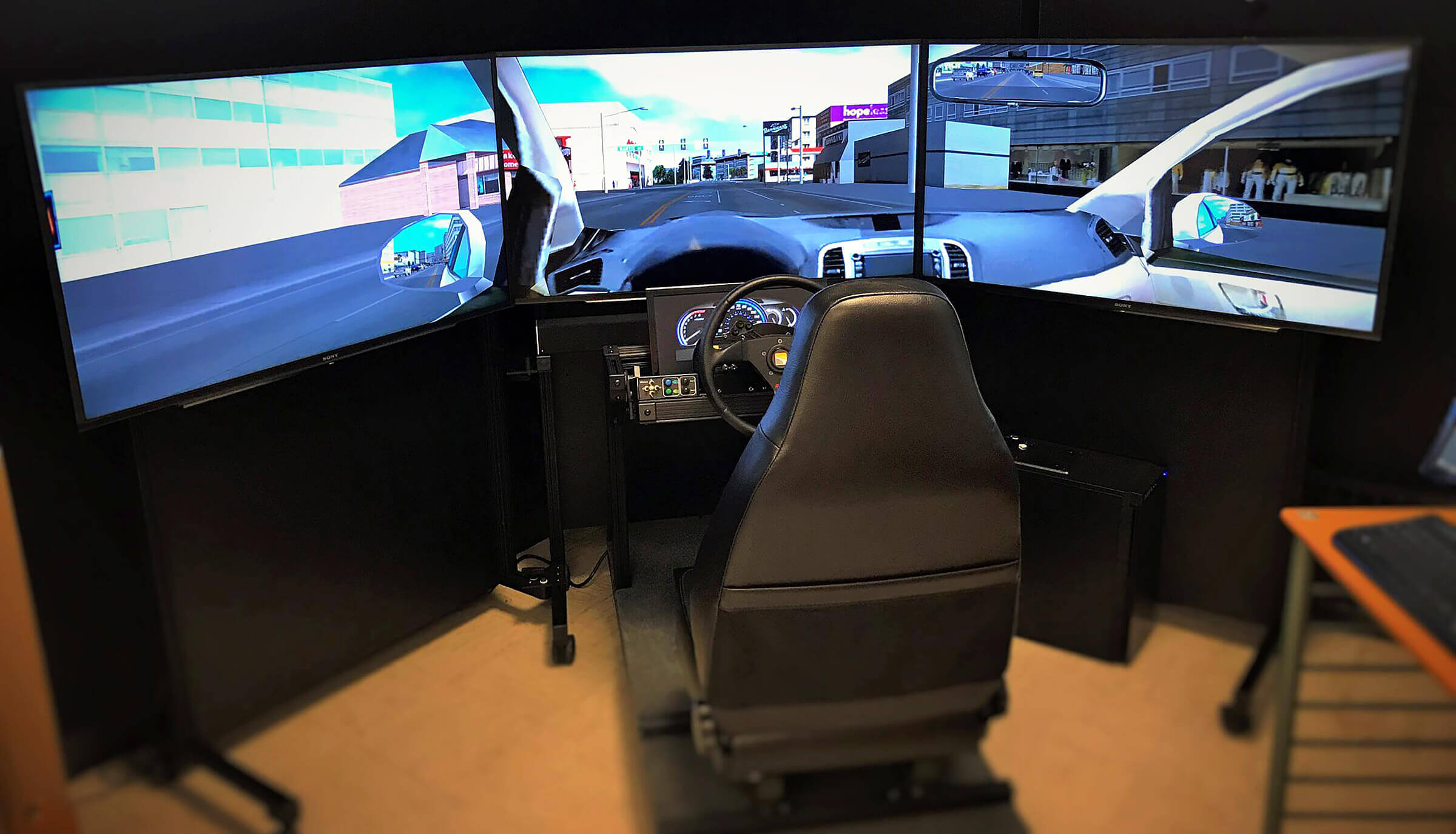 Experiments using this driving simulation will help researchers to develop algorithms that allow an autonomous vehicle to understand and predict human behavior. (Purdue University photo/DeEtte Starr)