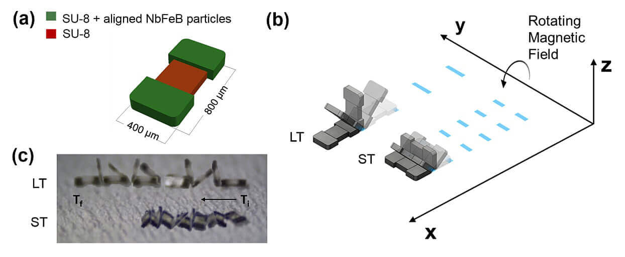 While concepts explored thus far have required complex designs and microfabrication methods, the μTUM is produced with standard photolithography techniques used in the semiconductor industry. The new paper focuses on the microrobot design, fabrication, and use of rotating magnetic fields to operate them in a strategy to negotiate complex terrains.