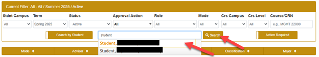Faculty can adjust the filtering criteria and click on “Search” to re-filter their queue results. Faculty will want to pay special attention to what Term is being used to filter their result.