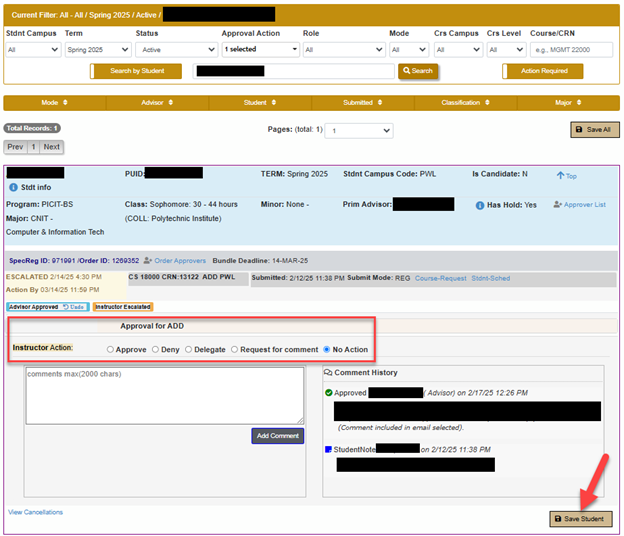 - As decision-makers enter their decisions, they will be recorded in the Comment History section where any activity related to the request is documented. In the above example, the Advisor has already approved, but the request is still pending Instructor action.