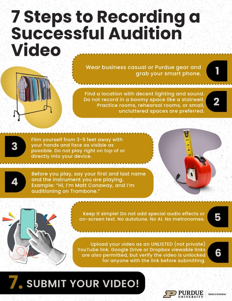 - If you do not have access to an appropriate audition instrument or access to any device capable of recording video, please contact Caitlin caitlin@purdue.edu for alternative audition instructions.