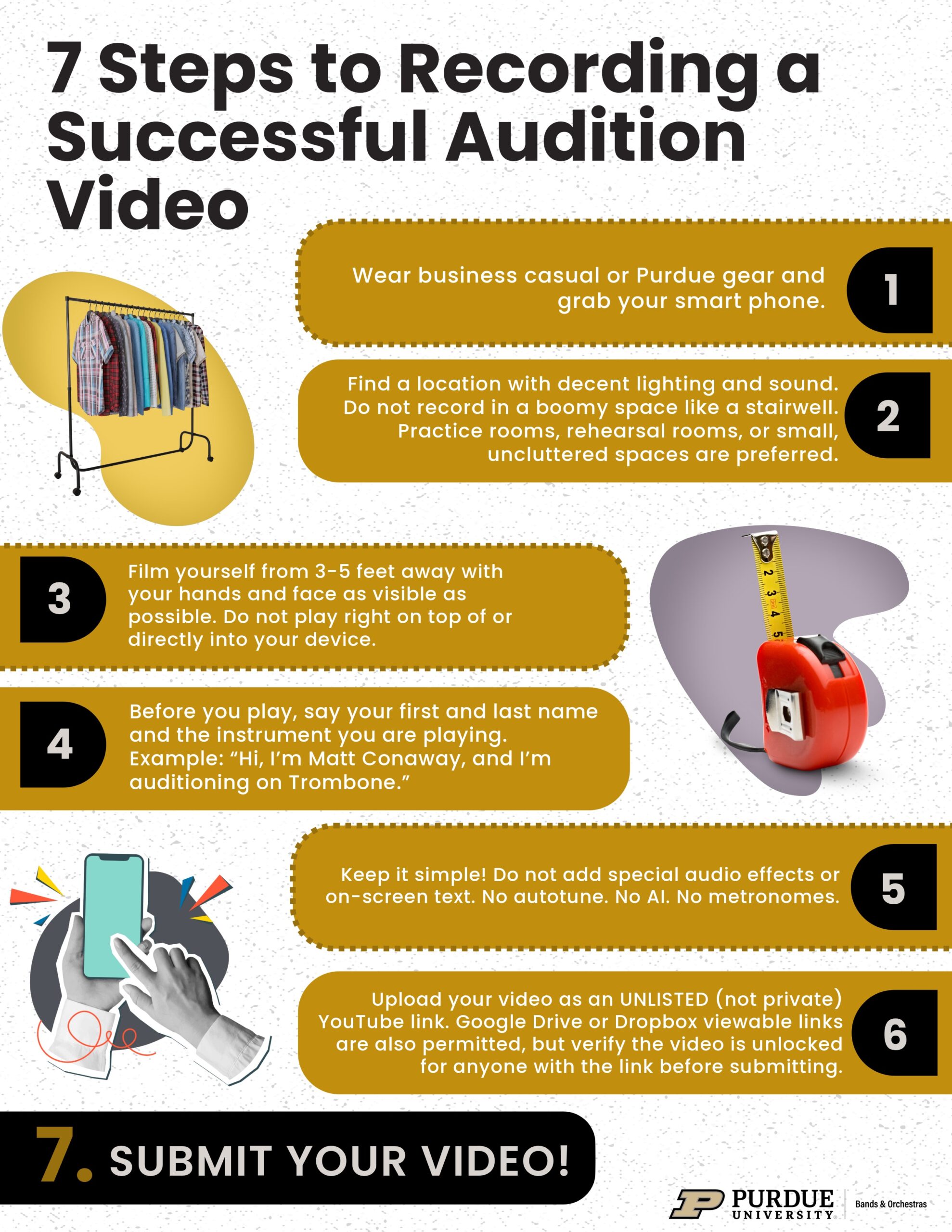 - If you do not have access to the instruments needed to perform your audition, please contact Caitlin at caitlin@purdue.edu for alternative audition instructions.