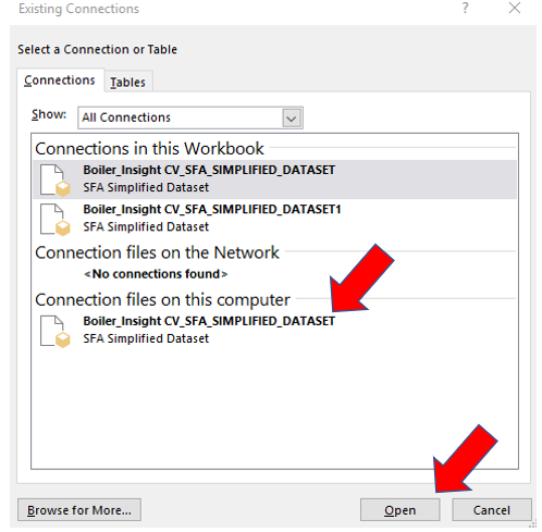 Select the SFA Simplified Dataset from the list of available connections and click Open.