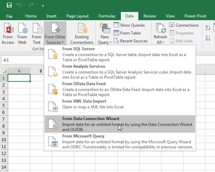 - For other versions of Excel (2007, 2010, 2013 or 2016), on the Data tab in the Ribbon, click “From Other Sources”. In the drop down menu that appears, click “From Data Connection Wizard”.