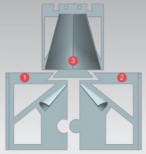 If the design is larger than the print area, you may have to break the design into smaller pieces that will be assembled later in order to be manufactured. An example of a design split into 3 pieces is shown below.