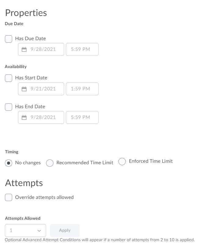 - The Special Access Properties page opens. On this page you will be able to change the due date, start date, end date, time limit, grace period, and/or the number of attempts for specific users to meet accommodation needs.