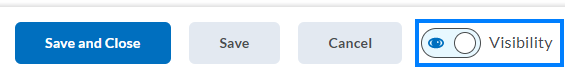 PLEASE NOTE: The difference between this visibility setting and the availability dates is that with availability dates, learners will see the assignment exists, but they will not be able to click on it. With the visibility setting, the assignment is hidden from learners until you return and change it to be visible. An assignment must be visible for the availability dates to take effect. - Click Save and Close when you have finished creating the assignment.