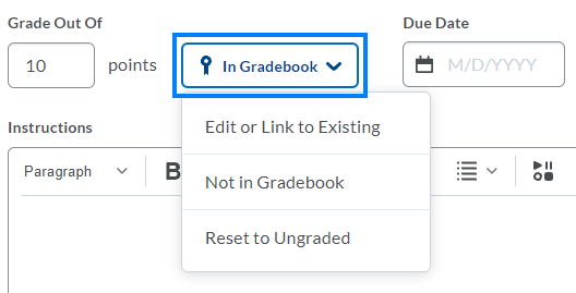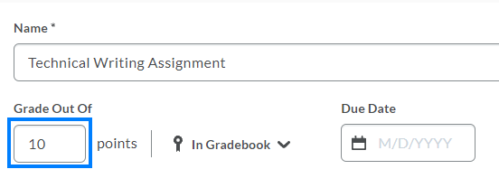 - If the assignment will be graded, click within the Grade Out Of text box and enter the point value of the assignment. An In Gradebook field will then appear, indicating a grade item will be created for this assignment in the gradebook.