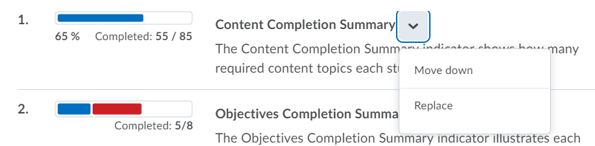 - The Settings page will show you items currently displayed on the Class Progress landing screen. Click the drop-down icon next to any indicator to move it up or down to reorder the way they appear on the landing page, or replace them with a different indicator.