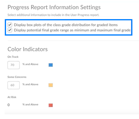- From here, you can modify which progress indicators you would like to display in the User Progress. You can also select which options they want to include in the report, such as grade distributions or potential final grades.