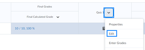 - Click the drop-down icon to the right of the quiz grade column and select Edit from the drop-down.