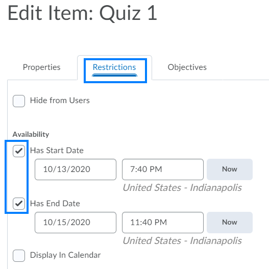 - Click the Restrictions tab. The Availability Start Date and End Date here control the availability (visibility) of the grade item to students. They are unrelated to the availability of the quiz itself. Students will be unable to see the grade item before the Start Date or after the End Date. Ensure these dates are either unchecked or include the dates you would like the grade item to be visible to students.