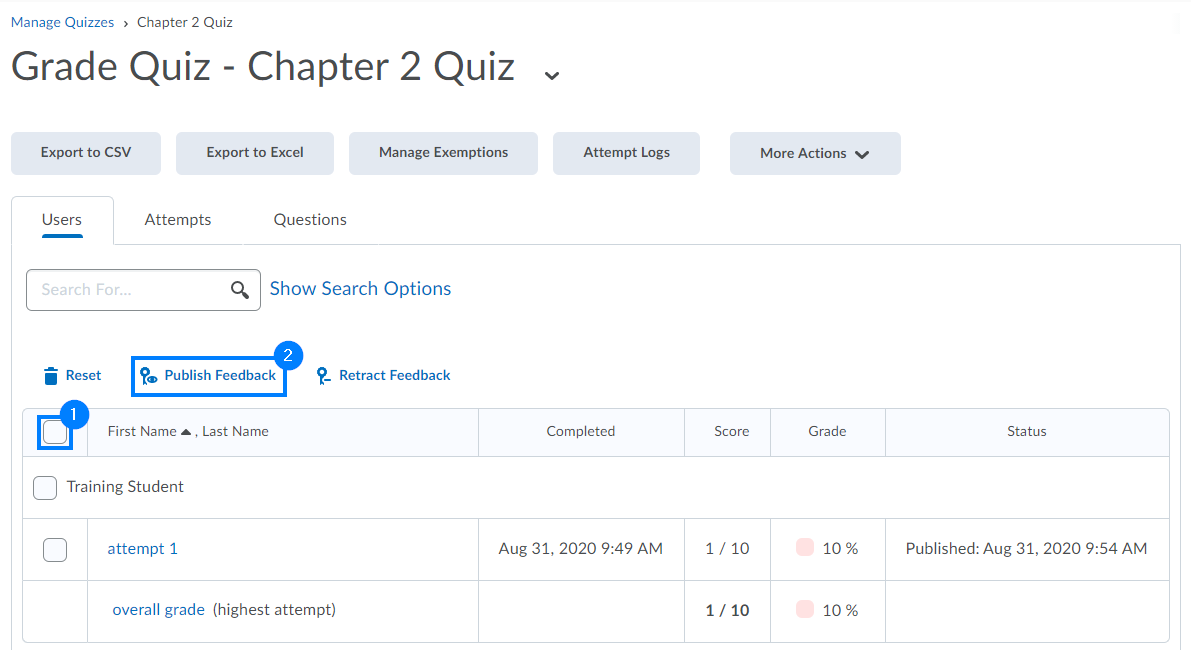 - Select all learners who have attempted and received a grade for the quiz. Then click Publish Feedback.