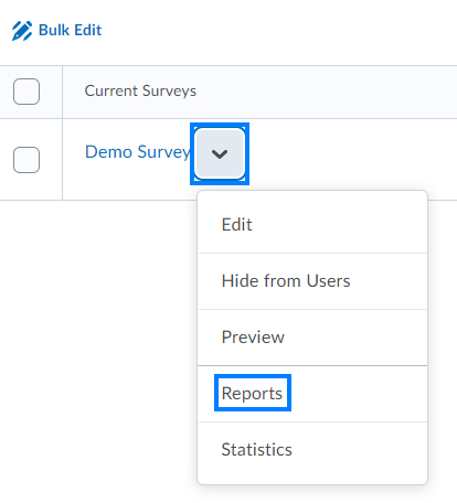 - Click the drop-down icon to the right of the survey name and select Reports from the drop-down.