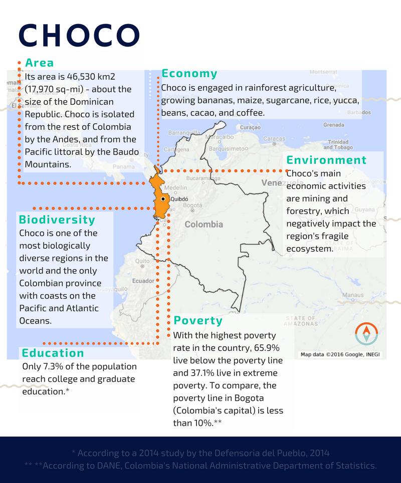 She was born in Choco, a province in Western Colombia with coastlines on both the Pacific Ocean and the Atlantic Ocean, unique ecosystems, and unexploited natural resources. Yet, 63% of its population living in poverty (National Administrative Department of Statistics, DANE - 2015). Her hometown, Quibdo, is the province's capital city, a 100,000 inhabitant municipality described as "one of the gloomiest cities in the world," due to its extremely wet and cloudy tropical rainforest climate.