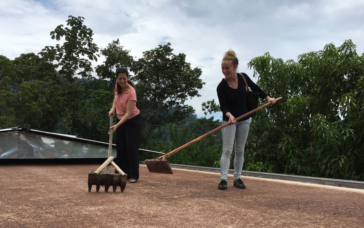 Colleen Kelly, graduate student in Youth Development and Agricultural Education, and Marcia Croft, graduate student in Horticulture and Landscape Architecture, practicing their cacao drying skills on a rooftop in Santander, Colombia on a structure called an elba.