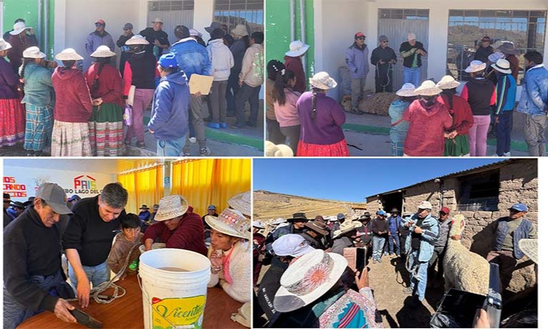 Members of the ‘Camelids’ Project during training events for alpaca producers in the highlands of Arequipa. Upper and lower picture: Dr. Víctor Pacheco, UNSA reproduction specialist, explaining the importance of early detection of alpaca pregnancy in Tisco and Chichas respectively. Photo credits: Alejandra Toro and Luis Sousa.