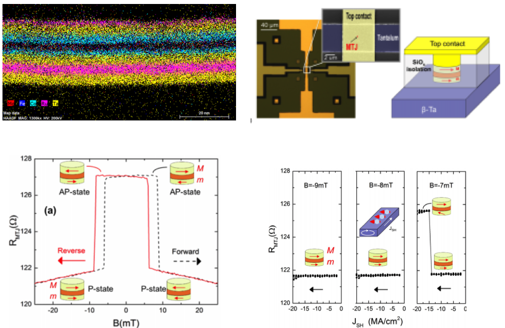 We have developed sputtering recipes to deposit ultrathin multilayers of β phase-Ta, MgO, Ru and ferromagnetic CoFeB with in-plane and out-of-plane anisotropy. Using the Spin Hall effect of β phase-Ta, we have demonstrated current induced magnetization reversal of CoFeB with perpendicular magnetic anisotropy (PMA). Magnetic layers with perpendicular magnetic anisotropy will enable scaling of spintronics devices down to few nanometers due to their higher thermal stability. We have also shown SOT based switching in Magnetic Tunneling Junctions (MTJ) on Ta(17) | CoFeB(2) | MgO(0.5) | CoFeB(4) | Ru+Ta cap(14) stacks with sizes of 400 x 200 nm2. Thick B-phase Tantalum used in these stack compared to usual thicknesses of 5-6 nm will allow integration of the technology on different substrates. (Related publication: AIP Advances 5, 107144 (2015)).