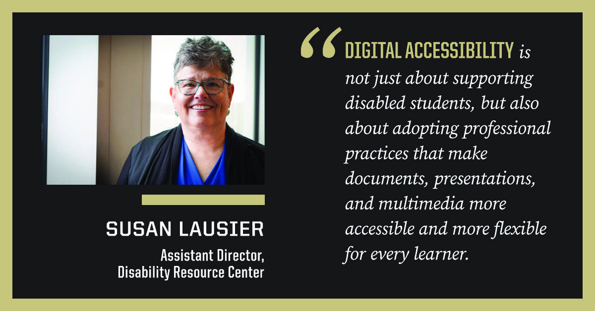 “Digital accessibility is not just about supporting disabled students, but also about adopting professional practices that make documents, presentations, and multimedia more accessible and more flexible for every learner,” Lausier says.