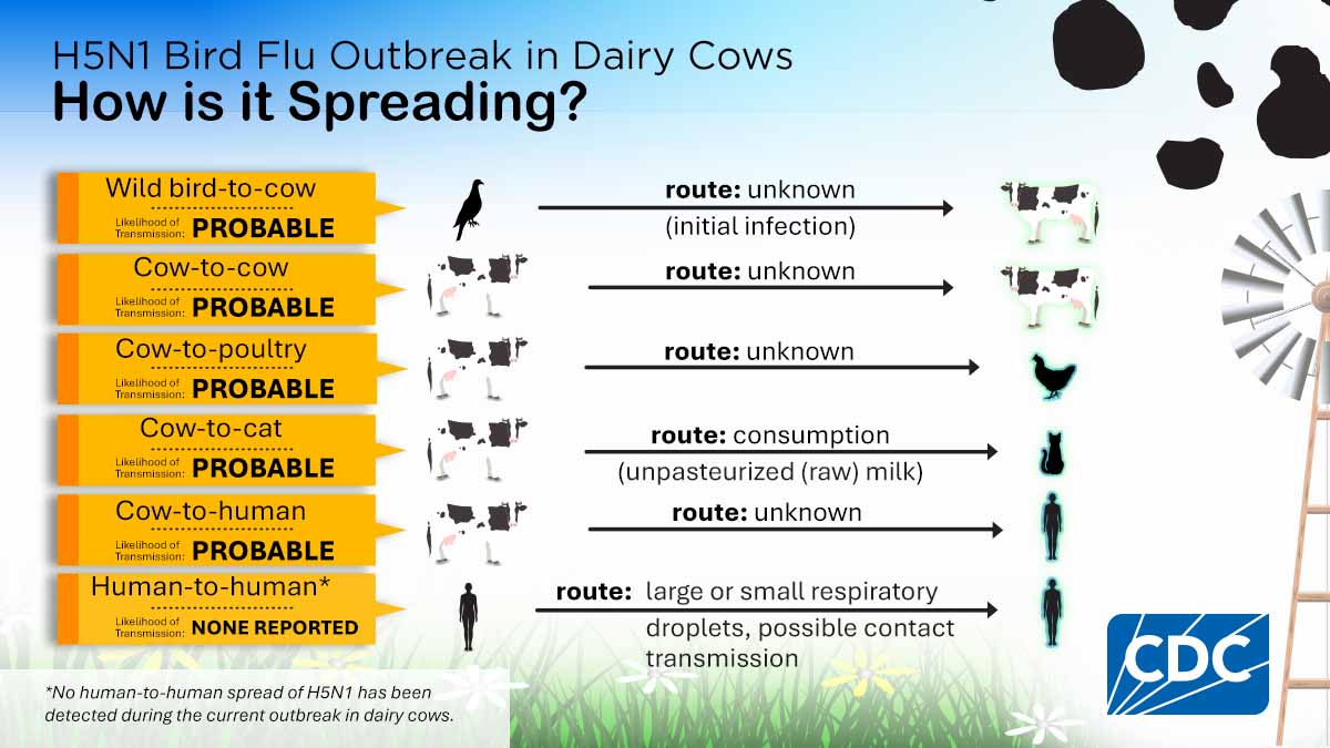 - H5 bird flu is widespread in wild birds worldwide and is causing outbreaks in poultry and U.S. dairy cows with several recent human cases in U.S. dairy and poultry workers.