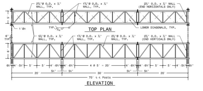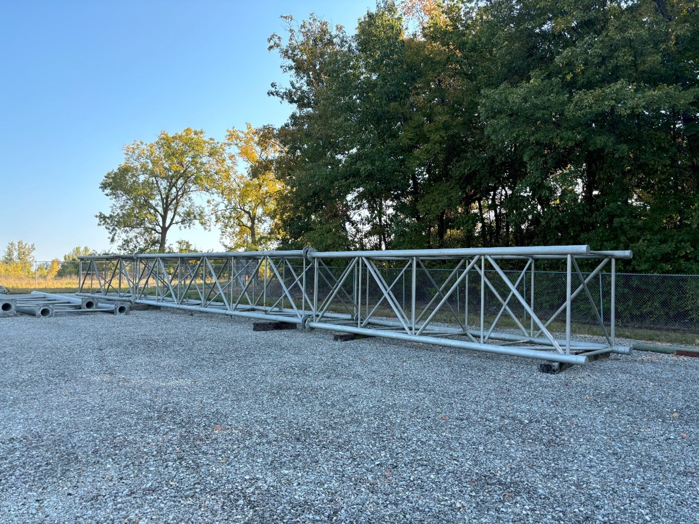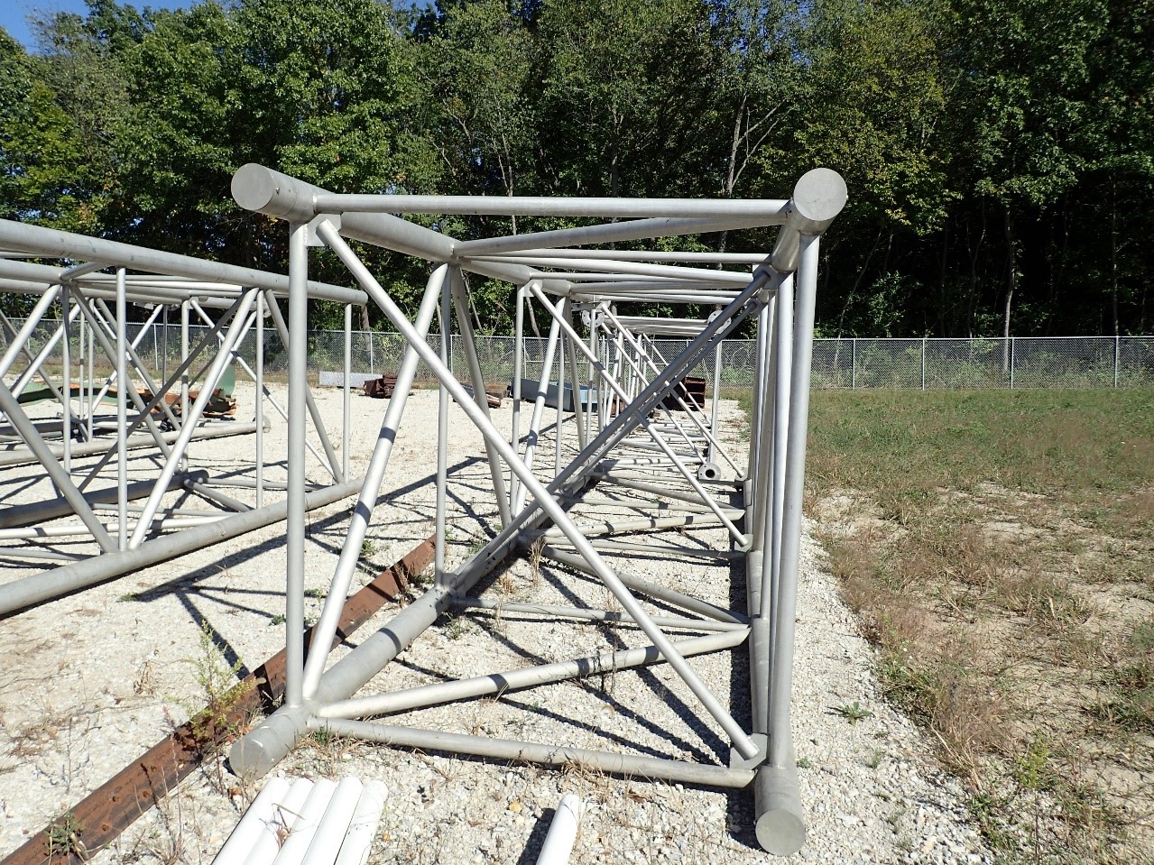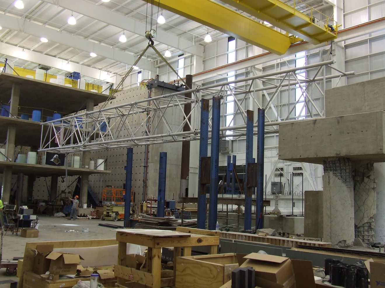 Destructive testing of a 70 ft and 55 ft aluminum four chord truss was conducted at Purdue University. The dead weight of the DMS sign was simulated by bolting scrap steel beams to one exterior side of the truss near mid-span. The scrap steel had nearly the same weight as the reported weight of the DMS sign. The wind load was simulated by hydraulic jacks and a wiffle-tree loading configuration. The force transmitted by the hydraulic jacks was monitored with load cells. Simple steel frames were fabricated for the purpose of mimicking the sign truss end supports. The U-bolt connections and saddles were arranged to provide boundary conditions that were similar to the truss-to-end frame connections that are found in the field. A fracture in a member was simulated by cutting the cross section of the tube with a reciprocating saw.