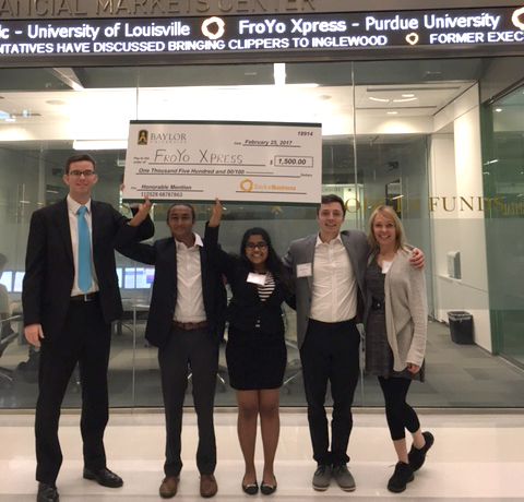 Four Certificate in Entrepreneurship and Innovation Learning Community students competed at the Baylor University New Venture Competition where they presented their idea for a frozen yogurt kiosk, placing in the top 12.