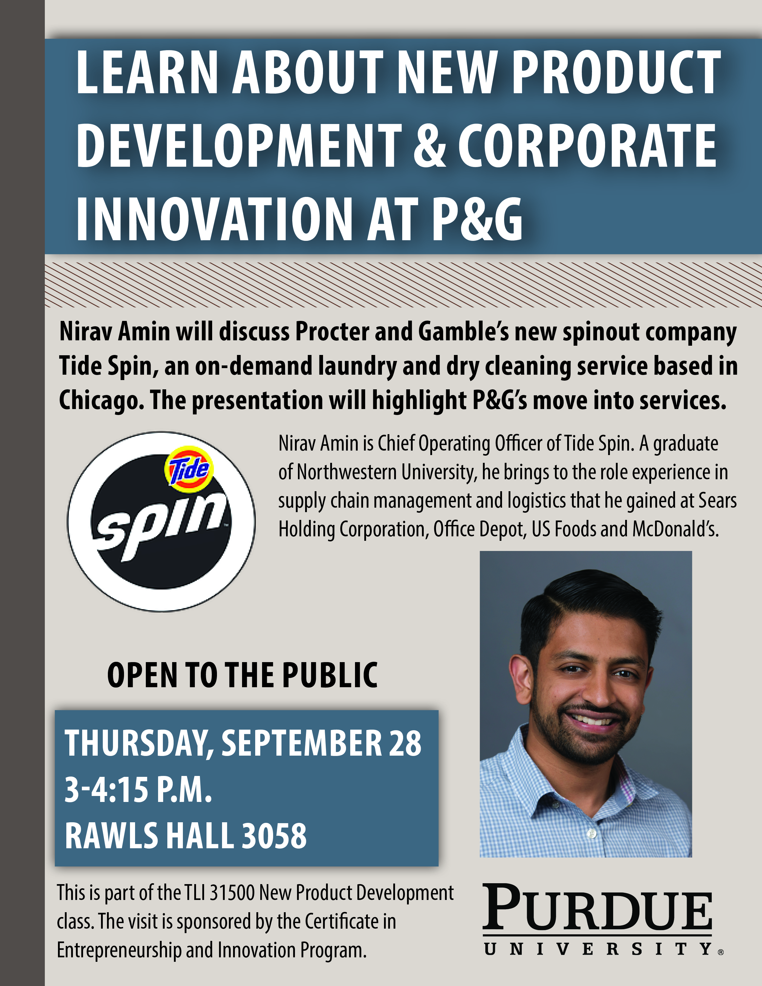 Nirav Amin works at P&G as COO of Tide Spin, an on-demand laundry and dry cleaning service based in Chicago. Amin will speak about his experiences of being innovative within a large organization.