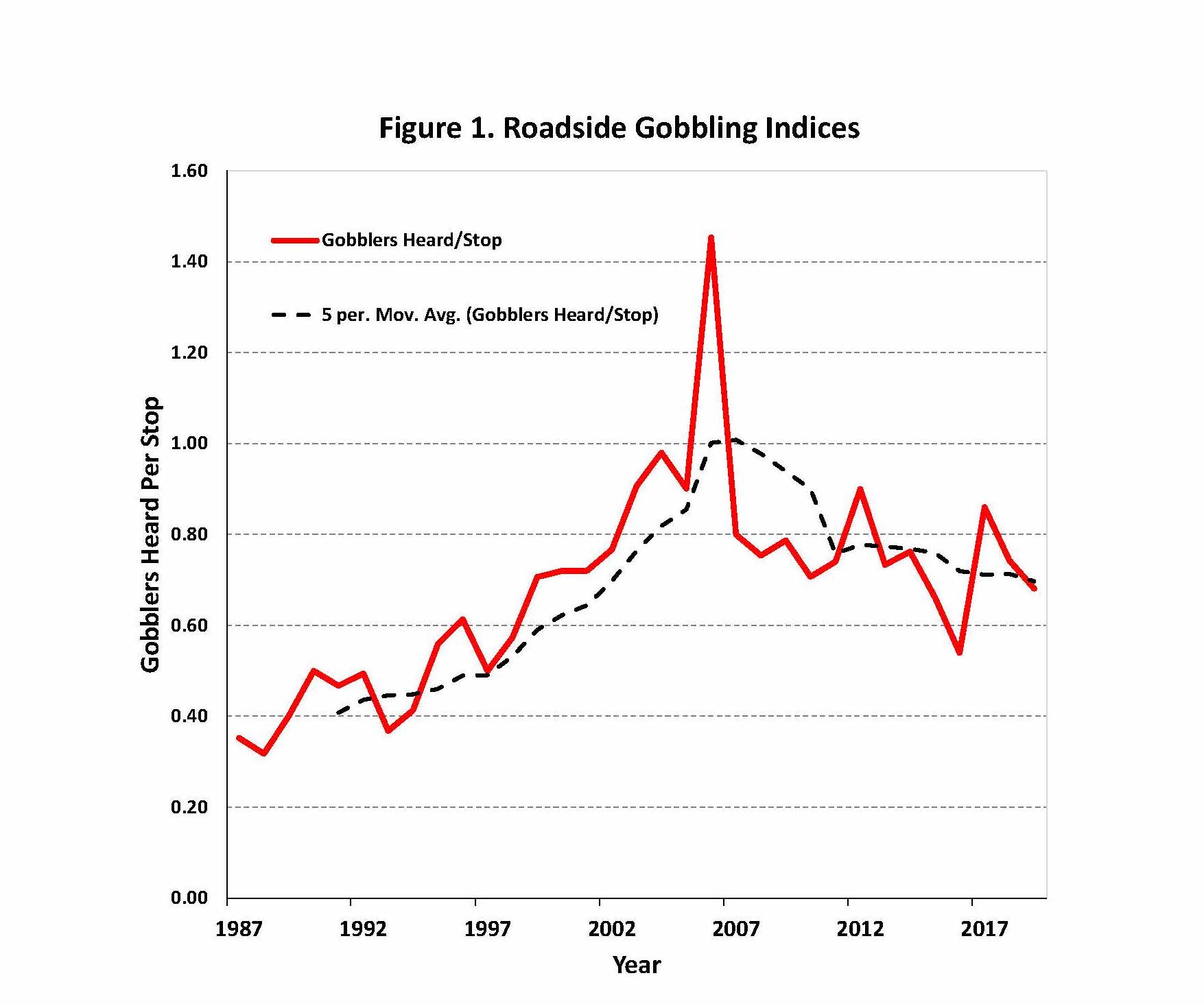 Roadside turkey gobbling indices from Indiana DNR annual surveys show an increase in gobbling activity in 2006. Source: Indiana DNR Spring Wild Turkey Gobbling Counts, 2020