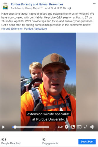 Check back in a few hours later at 6 p.m. for a live Q&A with extension wildlife specialist Jarred Brooke. He will offering habitat help and offering tips and tricks about establishing native grasses and forbs for wildlife. Tune in on the Purdue FNR Facebook page. https://www.facebook.com/PurdueFNR/