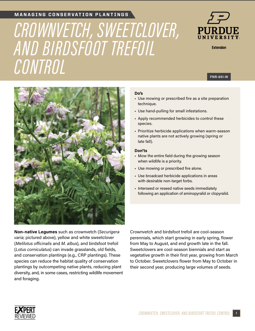 First page of Crownvetch, Sweetclover and Birdsfoot Trefoil Control publicationDiscover the impact of non-native legumes like crownvetch, sweetclover, and birdsfoot trefoil on grasslands and conservation plantings. This guide provides control options for these non-native legumes. Essential reading for conservationists and land managers interested in grassland ecosystems: Crownvetch, Sweetclover and Birdsfoot Trefoil Control.