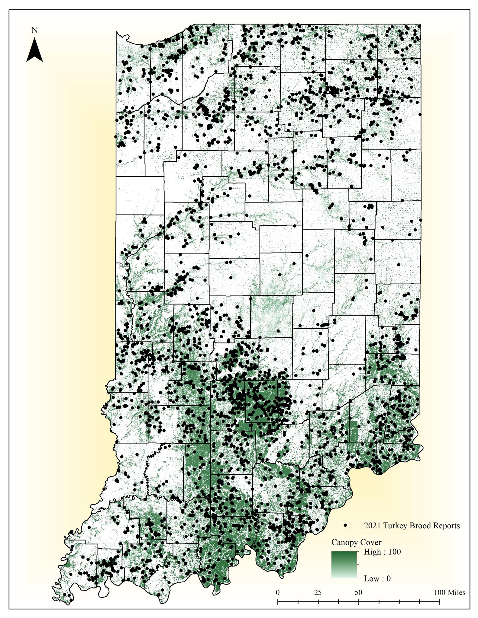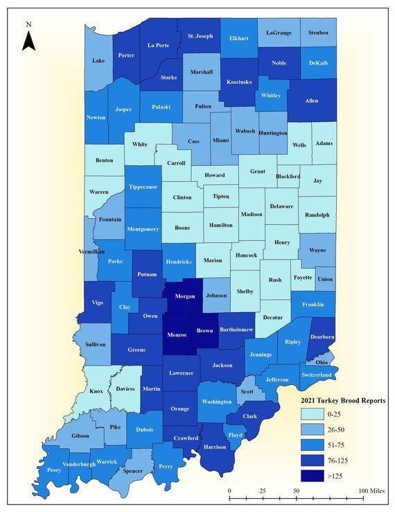 Indiana Division of Fish and Wildlife Facebook: Thank you turkey brood reporters! With your help, we were able to obtain more than 5,100 turkey brood observations in Indiana. This will allow us to complete the first-ever regional analysis of turkey production by region. Observational data aligned very closely with available turkey habitat (forested areas shaded in green). Check out our maps below for a comparison!