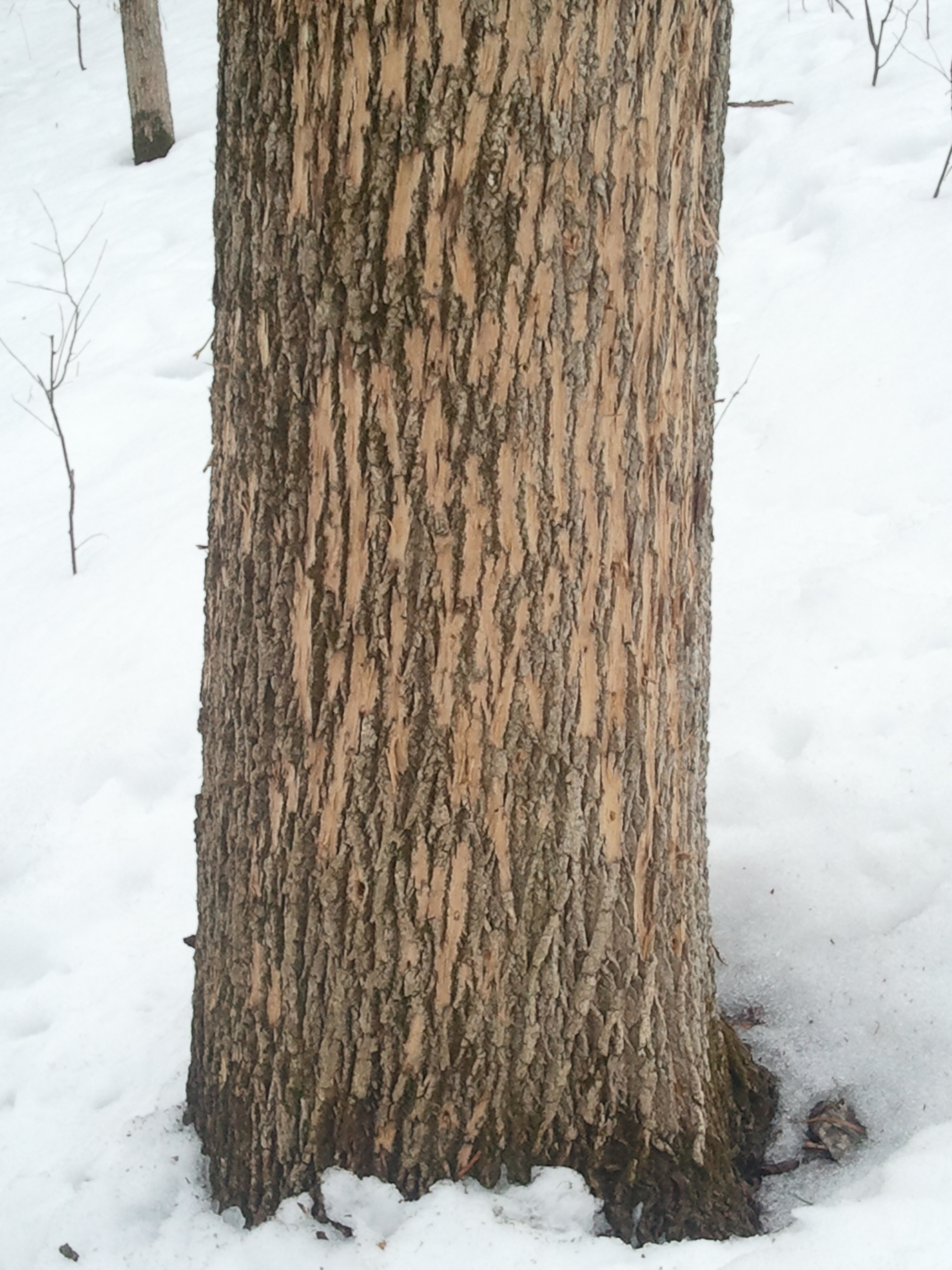 The answer to both of those questions for ash trees around the state is Emerald Ash Borer and woodpeckers. As Emerald Ash Borer spreads across Indiana, the population of Emerald Ash Borer larvae overwintering under the bark of ash trees can quickly increase. These grubs provide a tasty treat and important winter and early spring nutrition to hungry woodpeckers. Woodpeckers of several species are experts at detecting and extracting these grubs by pounding holes in tree bark. Ash bark is generally gray on the surface, but the inner bark is a light corky tan color. Once the woodpeckers find the EAB larvae, their excavation activities flake off the outer bark to expose the lighter colored inner bark. This is actually one of the best indicators of the presence of Emerald Ash Borer in a tree. The woodpecker activity often starts in the upper main stem and branches of ash trees, but as the population of EAB larvae in the trees increase, the woodpecker activity spreads down the trunk of the tree. Trees with this much inner bark exposed indicate an advanced infestation of EAB and signal ash tree mortality in the next year or two.