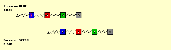 This reciprocity of forces and deflections is valid regardless of the stiffness values of the springs. Consider an animation of this example shown below. In the top part of the frame, the force is applied to the blue mass, and in the lower part of the frame the same force is applied to the green mass. From reciprocity, the static deflection of the green mass in the top part of the frame is the same as the deflection of the blue mass in the lower part of the frame. (Note that the system in the lower portion of the frame has been shifted to the right to align the green mass on the top with the blue mass on the bottom.)